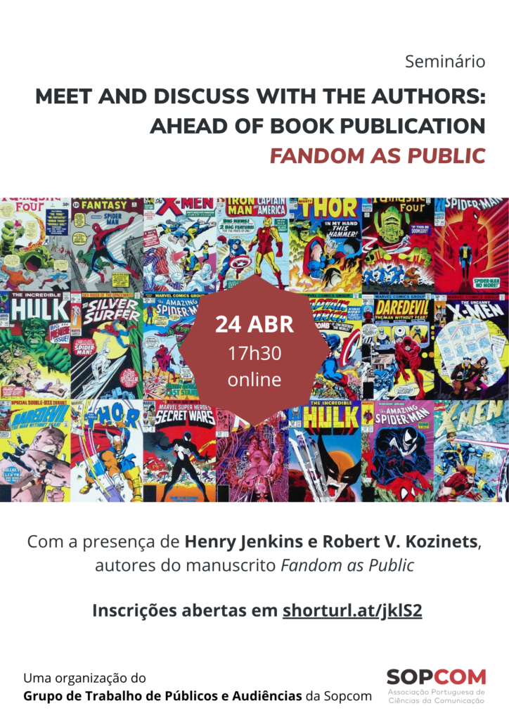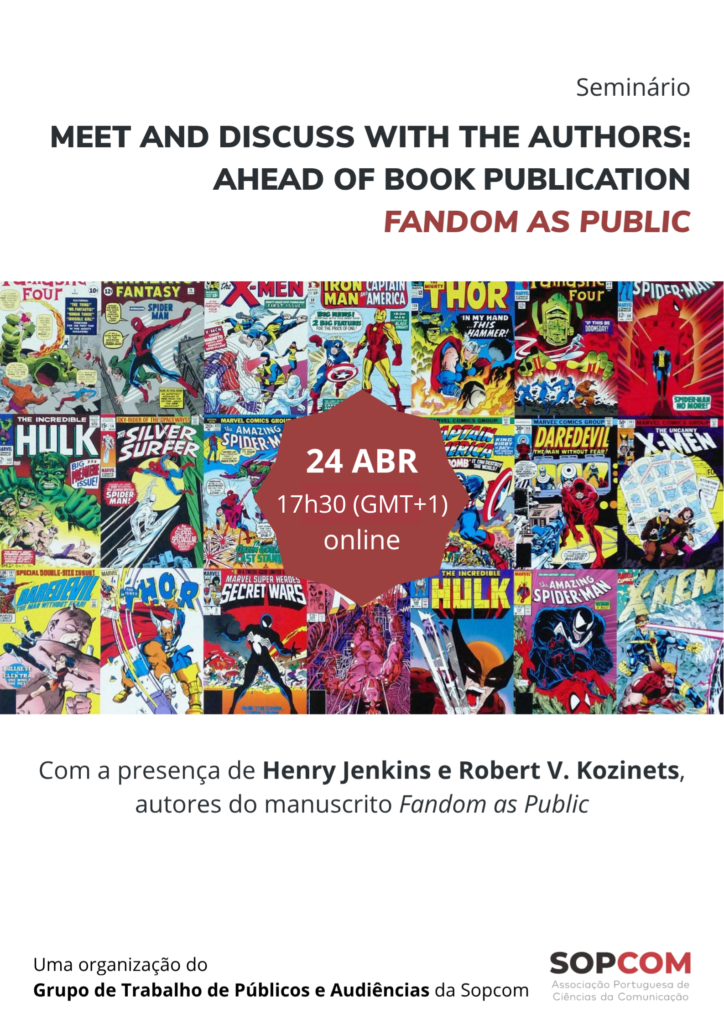 No próximo dia 24 de abril, a partir das 17h30, o Grupo de Trabalho Públicos e Audiências da SOPCOM promove o seminário online “Meet and discuss with the authors: Ahead of book publication of Fandom as Public”. As inscrições podem ser feitas aqui: https://forms.gle/U3Zfw96NwzCzSUk4A.